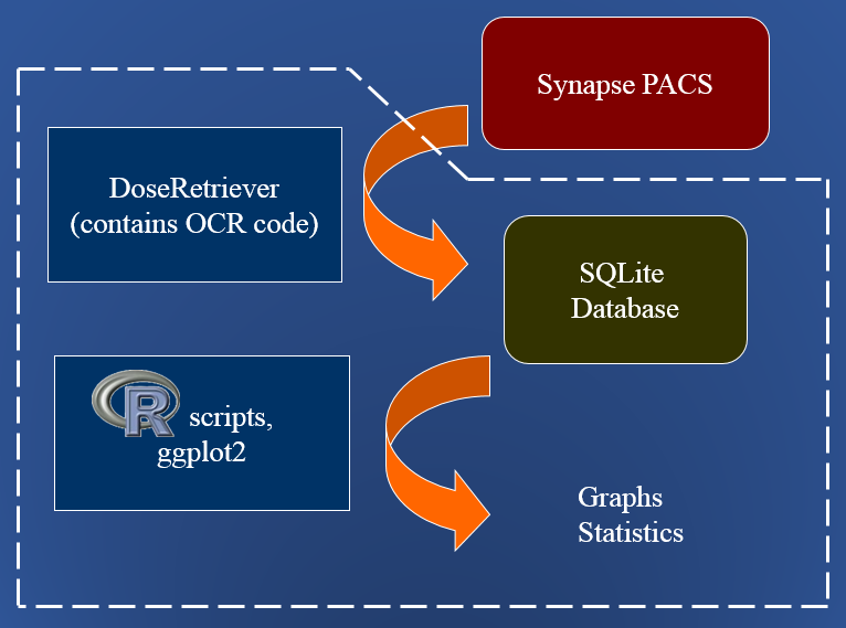 This system extracts radiation dose information from graphical dose screens from GE, Siemens, Toshiba, and Philips scanners. An exact glyph matching algorithm is used to extract the dose text.