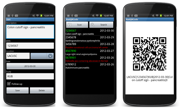 Due to security and privacy concerns regarding networked transmission of unencrypted text in e-mail or online documents, QR codes may be a useful alternative to manual transcription of such data. We demonstrate the use of QR codes for acquisition and sharing of case metadata between mobile devices without use of the network.