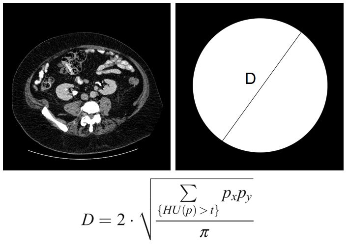 Normalization of CT radiation doses for body size is essential for detecting scan protocol deficiencies, particularly for small or pediatric patients. We describe a method for automated calculation of patient effective diameter from reconstructed CT images.